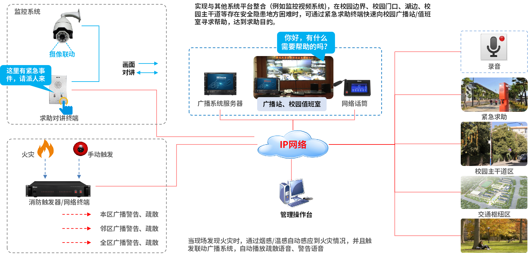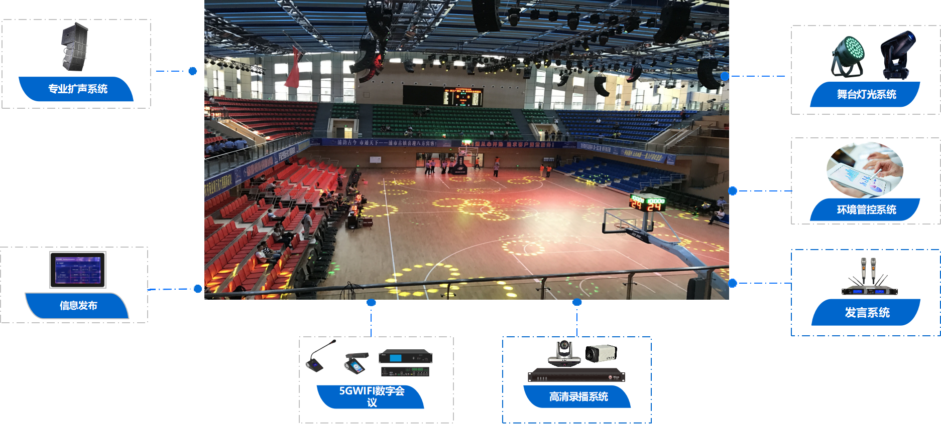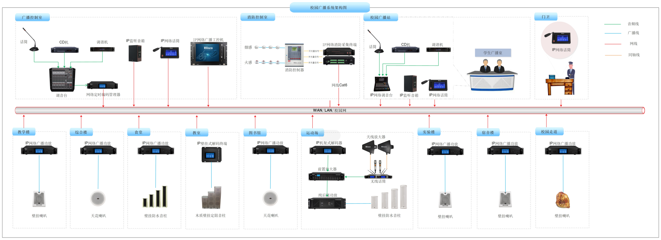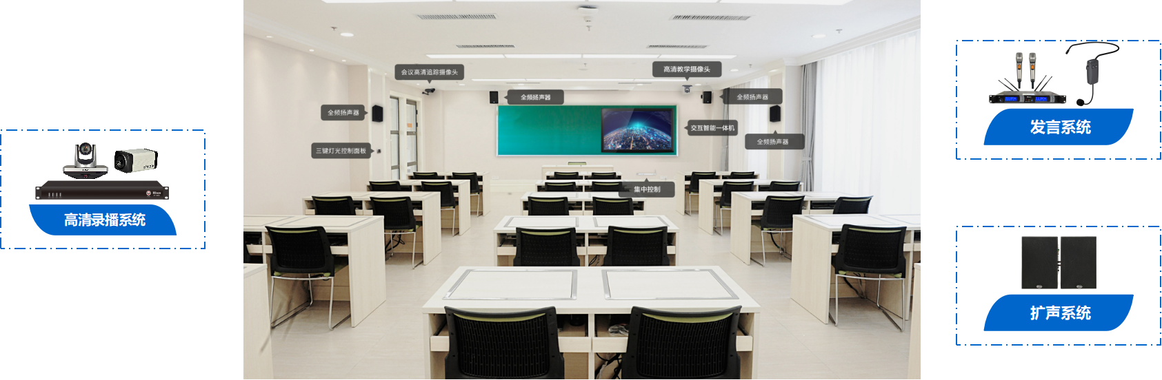 校园广播系统:校园广播系统主要覆盖教学楼、实验楼、综合办公楼、图书馆、宿舍楼、校园主干道、风雨操场、运动场等场所,校园广播系统满足学校日常教学功能需求。