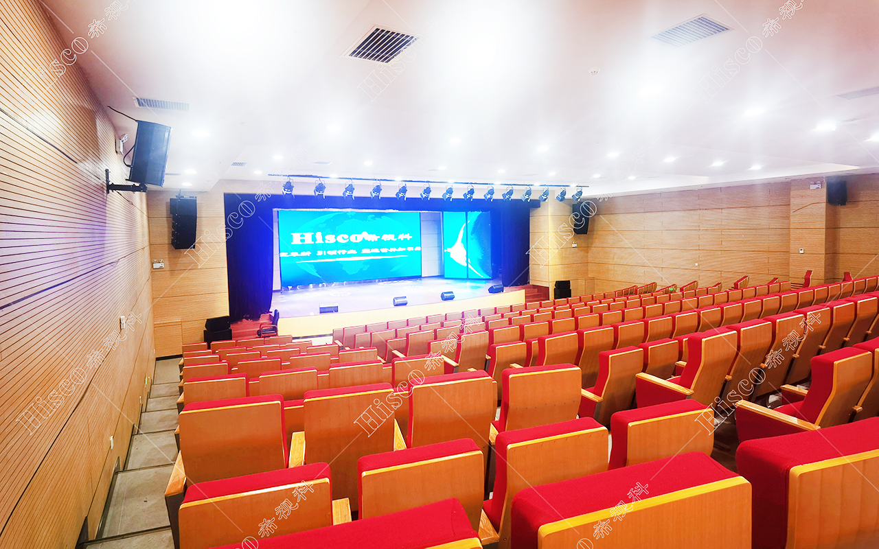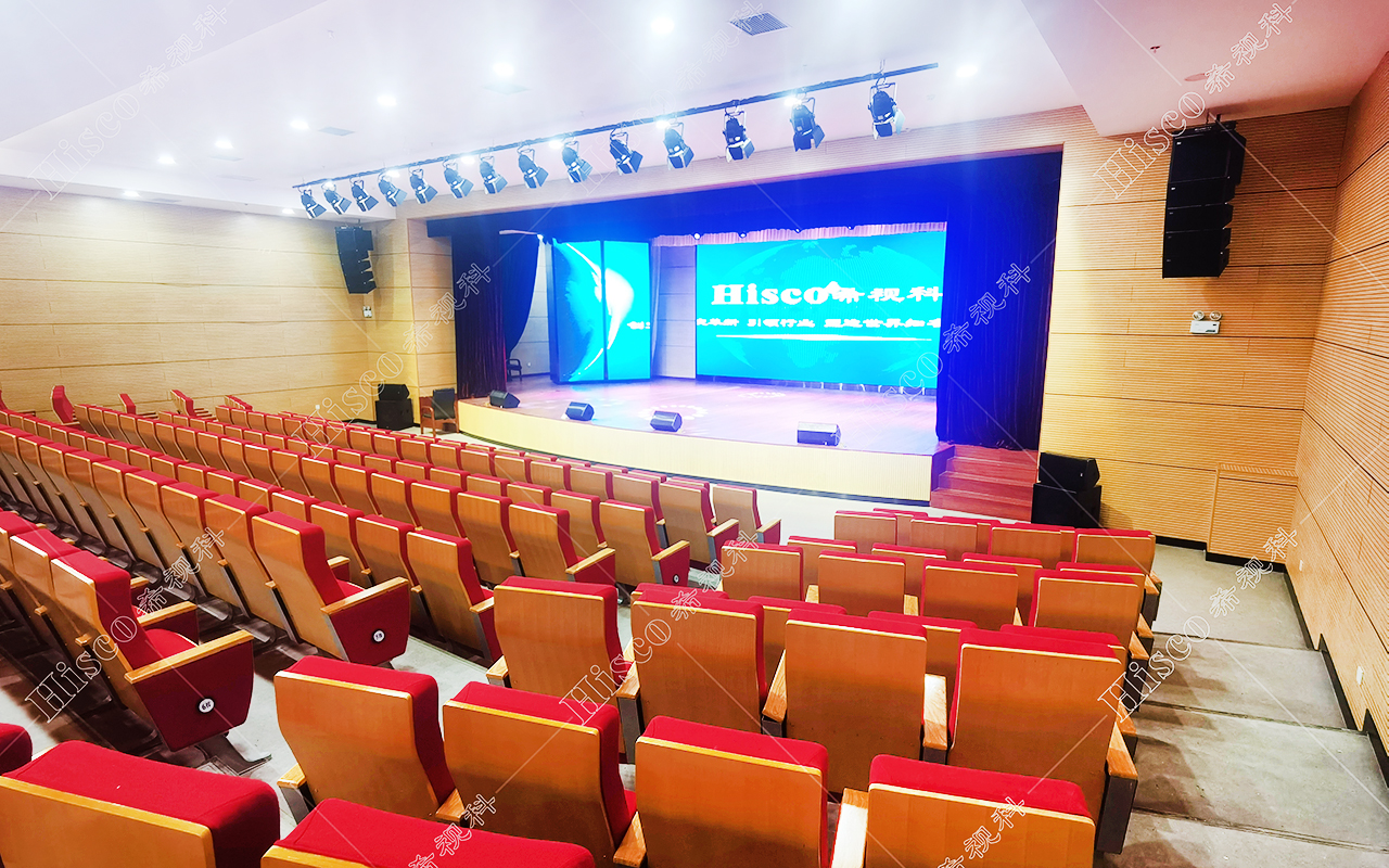 本校报告厅是一个中大型报告厅,主要为举办学校学术会议、演讲、公共大课培训及各种文艺演出,根据其建筑结构特点和使用功能及国家相关标准,根据面积和观看距离选择合适的LED大屏,展现整个舞台的宏伟大气;扩声采用集中与扩散相结合的扩声方式,开会和报告时采用单声道集中扩声还原模式,所有音源都从主席台发出,声像的平衡、方位无倾斜,保证了下面学生听到的直达声响度和均匀度达到要求,让学生听的适宜和舒服。演出时采用左右立体声空间成像模式,直达声与辅助音箱的效果声相结合表演,传达表演意境,使得演员和观众之间产生一种无声的交流。