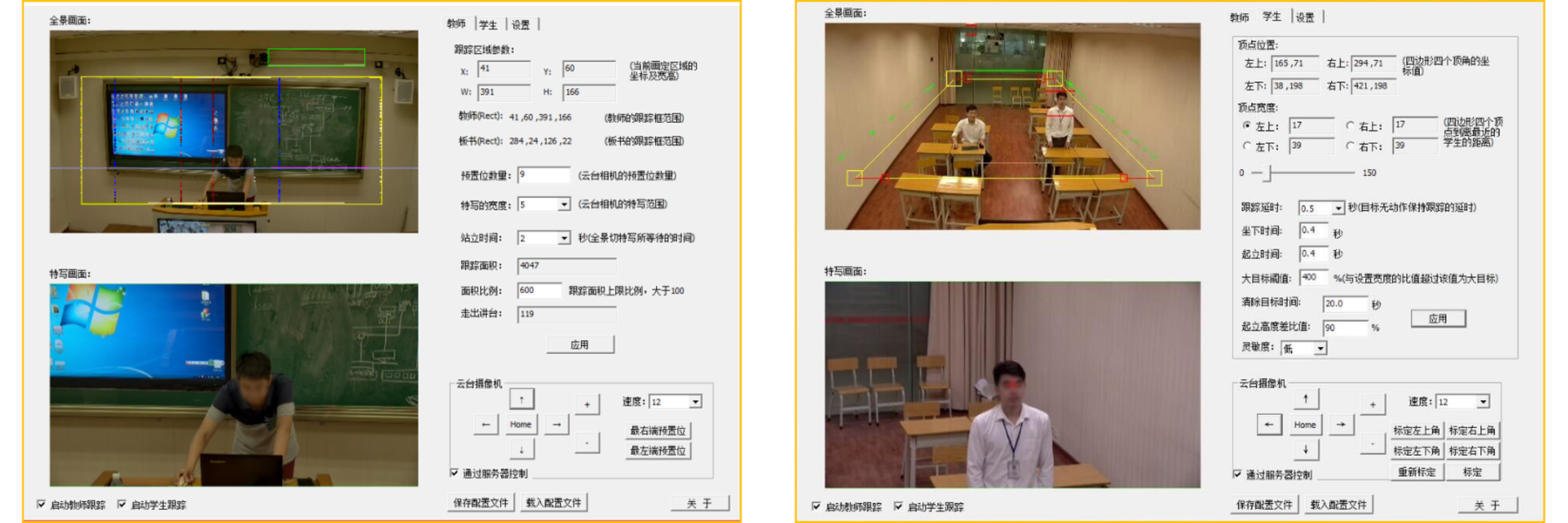 • 智能跟踪,无需额外跟踪主机和分析摄像机,录播主机内嵌有图像识别和图像跟踪模块,根据全景画面图像进行分析,使用最先进的跟踪算法,准确率达90%以上。