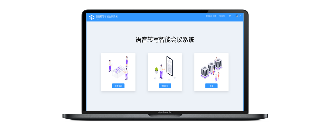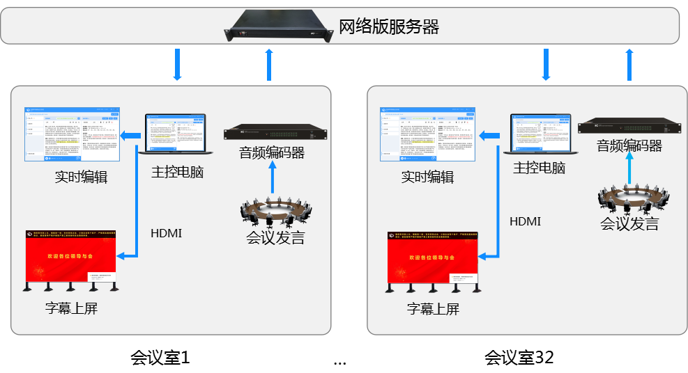 多会议室时配语音转写服务网络版,统一提供语音转写服务能力,支持多达32间会议室同时使用。每间会议室只需配备一台管理电脑和会议相关设备。